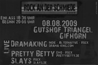 ![]() | 08.08.2009 OpenAir "Rock an der Schmiede" (Triangel) Mit den Triangelern Locals von Slays und den Hildesheimern Pretty Betty gehts auf das OpenAir-Festival "Rock an der Schmiede" an der besagten Schmiede in Triangel bei Gifhorn. |